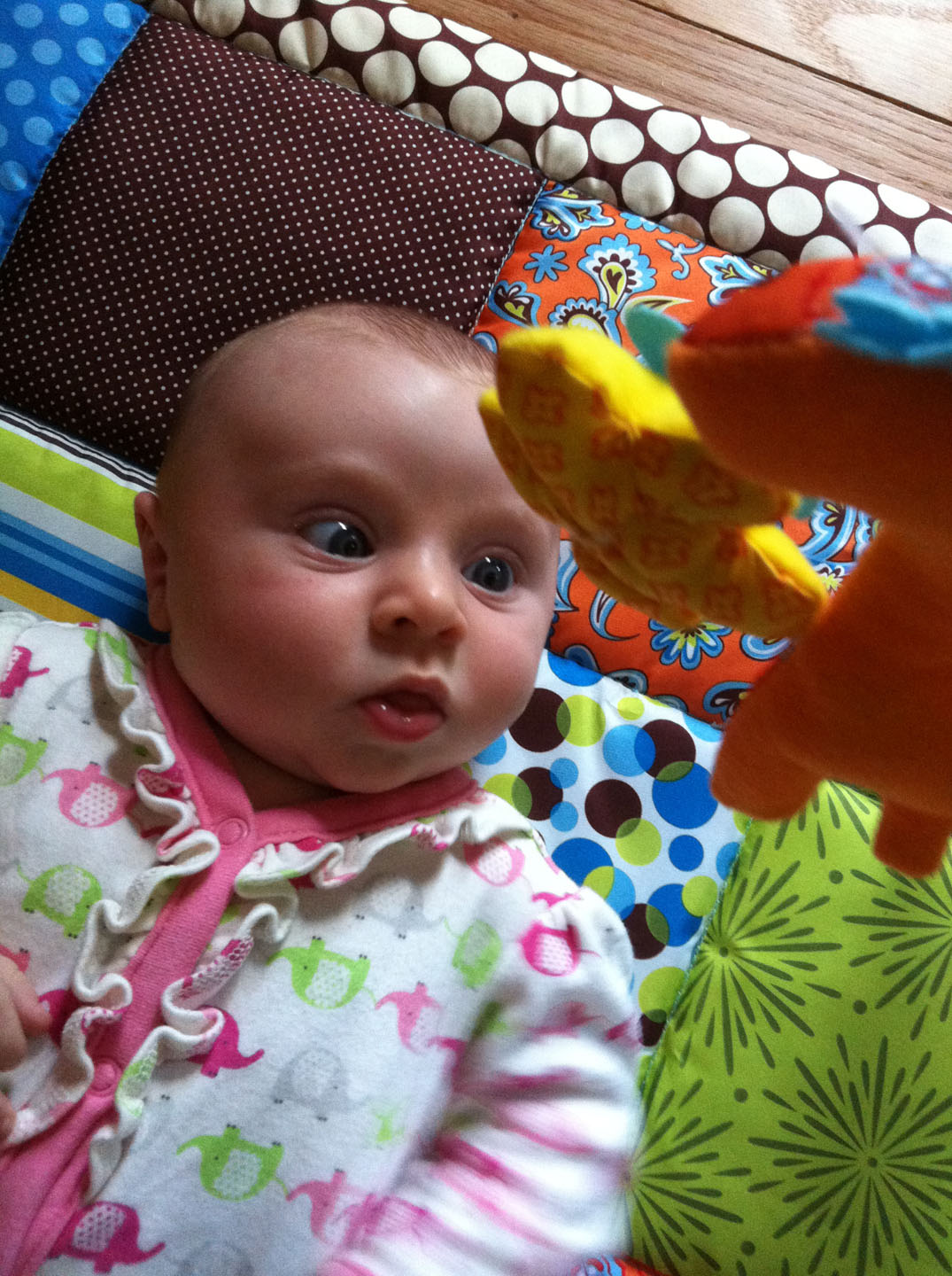 You are now 3 months old. Congratulations to us, we’ve made it through the 4th trimester. I guess you are officially ready to start your life out in the world. We’ve seen some major changes this month. Truthfully, you learn something new everyday. I’m constantly amazed by you. You’ve really started to interact with your world. You lay in your play gym, and grab at the hanging toys. It was just a few weeks ago that you hated even being placed there on the floor. You are starting to like tummy time, especially if we turn on a little PBS Kids in front of you. Don’t tell your Grandparents, but you are mesmerized by the television. Your Dad and I can’t watch when you are in the room. When it’s on, you pay attention to nothing else! You started sleeping through the night this month. Though it’s still inconsistent, we’re just happy knowing it’s possible. You smile non-stop, it melts your Dad when he sees you smile first thing in the morning. You’ve discovered your feet, hands and tongue. All day you’re drooling and making tongue noises at me, it has replaced your previous dry coos. Last week you held your right hand in the air and stared at it all day long. It only lasted for a day, now you’ve discovered them, and its old hat. You apparently don’t need to stare at them anymore, you know they are there, and you know how to use them.